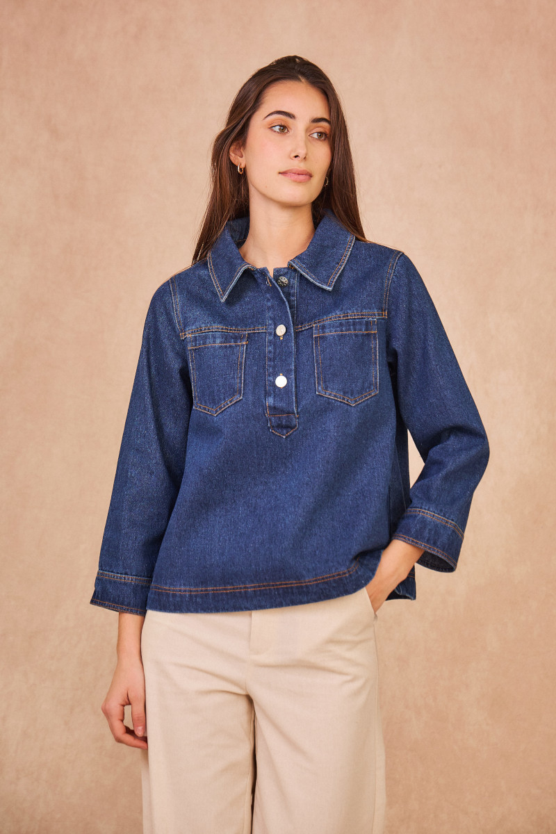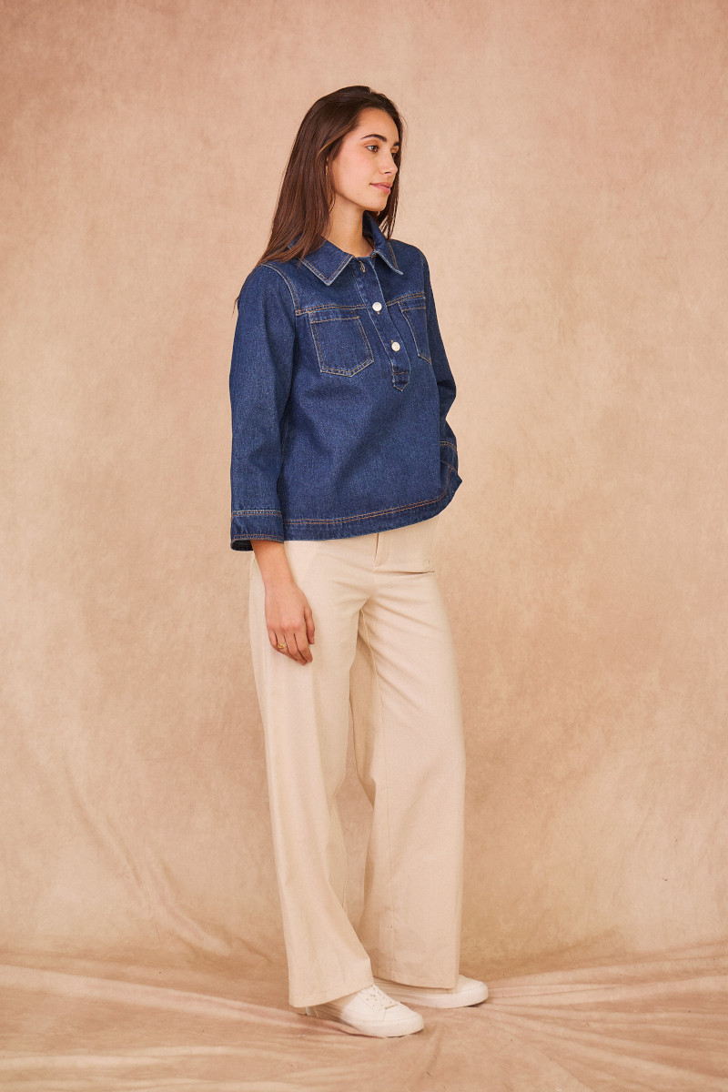 Coupe évasée, poches plaquées poitrine, col polo et pli creux au dos.