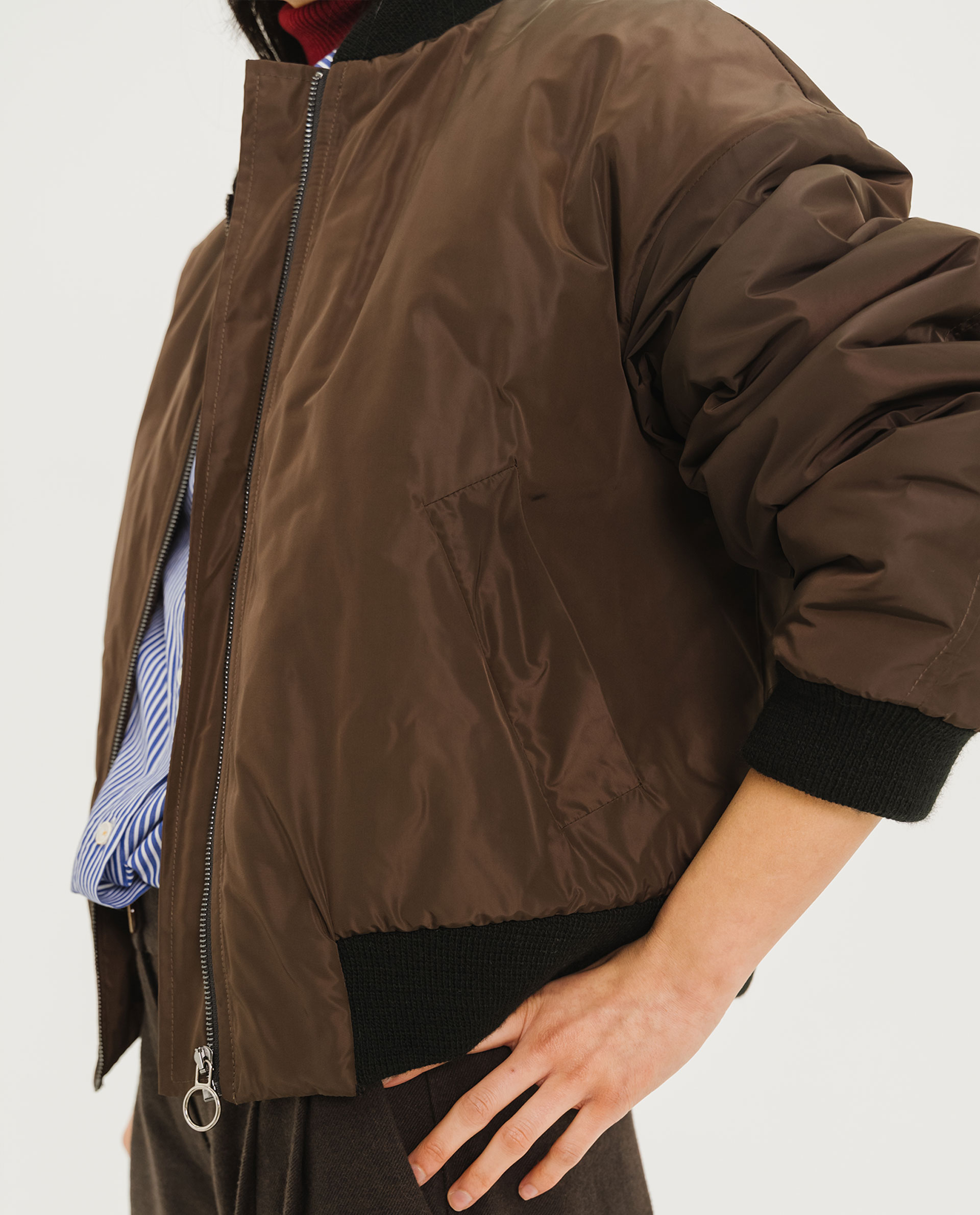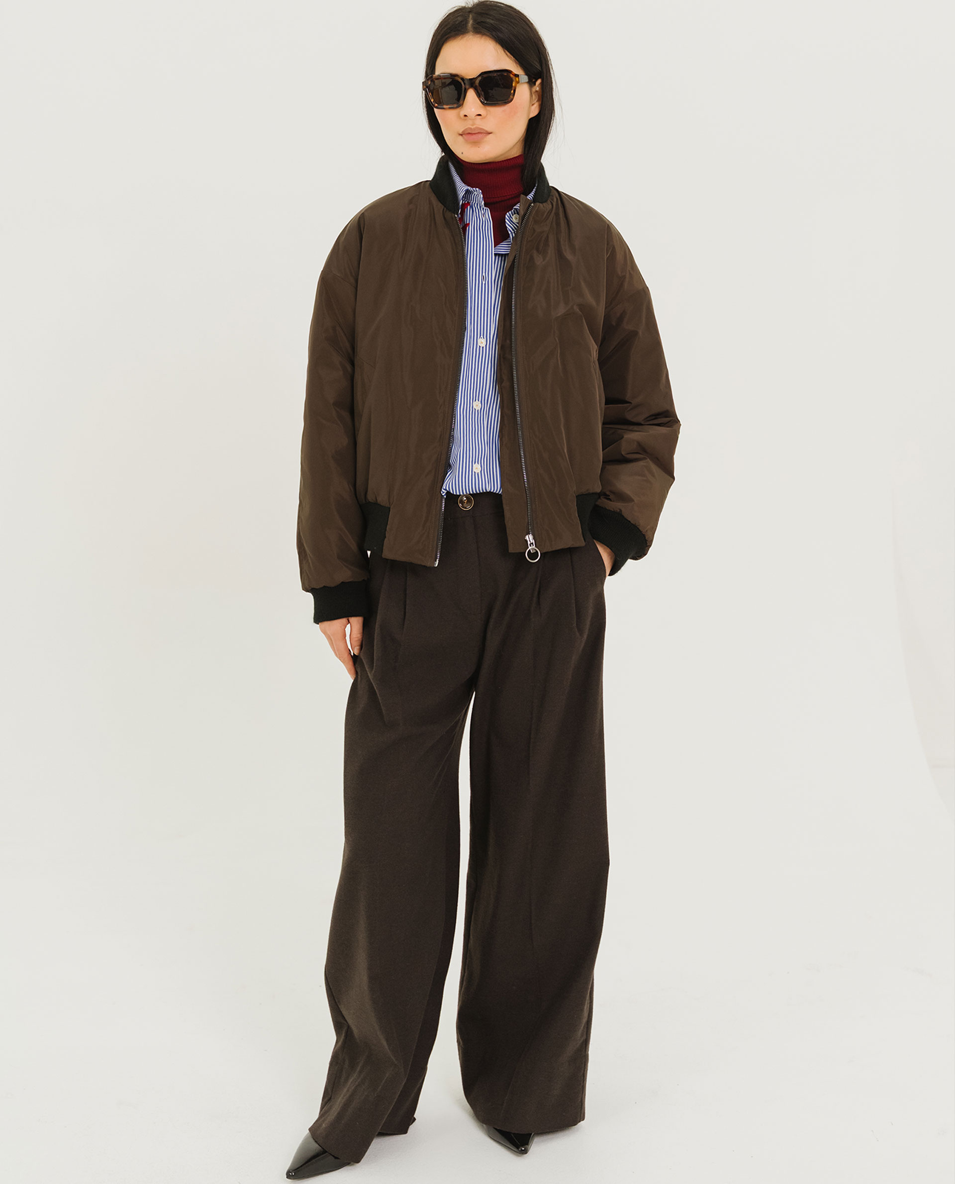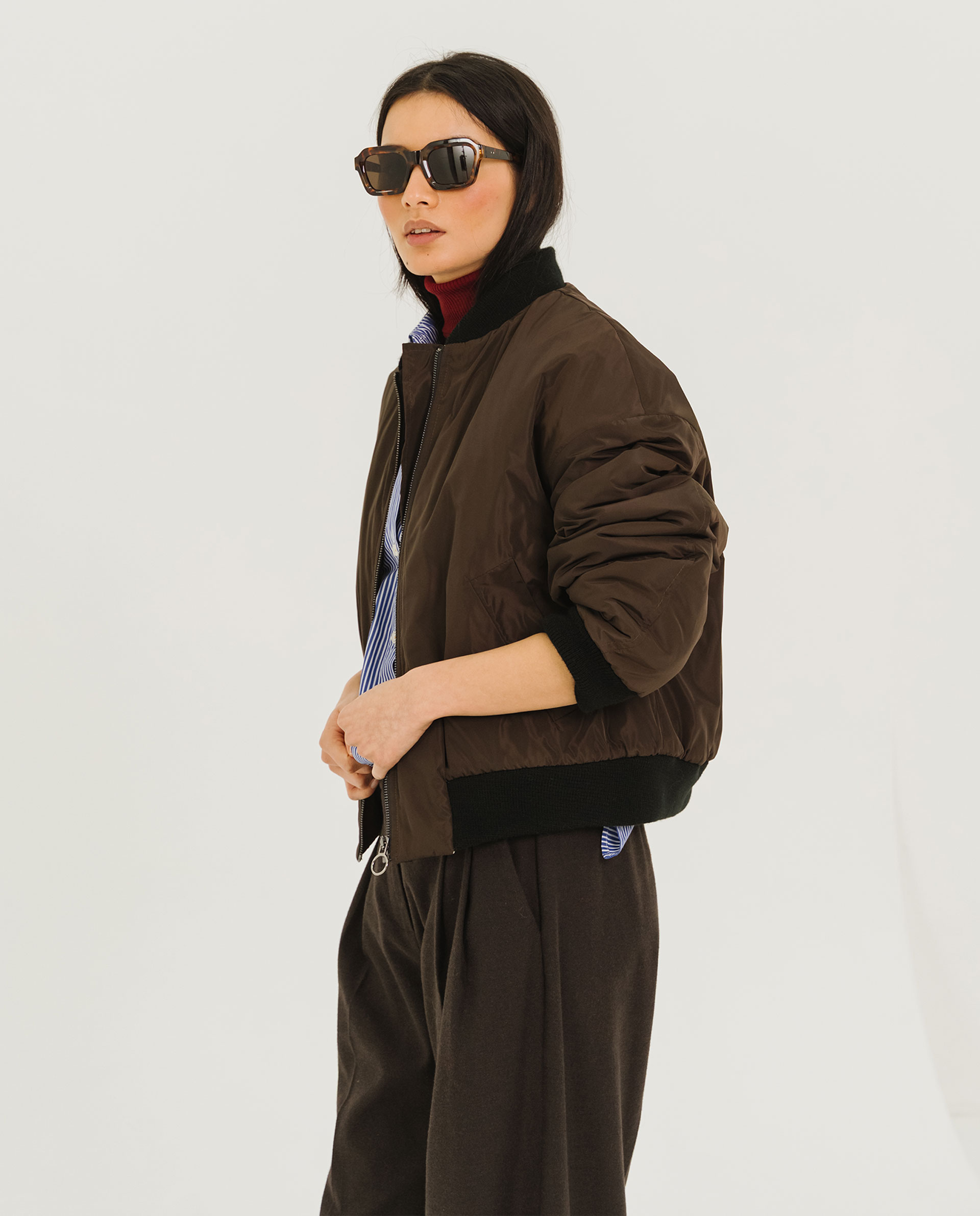 DEAN est un blouson qui réinterprète les bombers vintage. Col banane en bord-côtes, zippé devant et poches passepoilées.