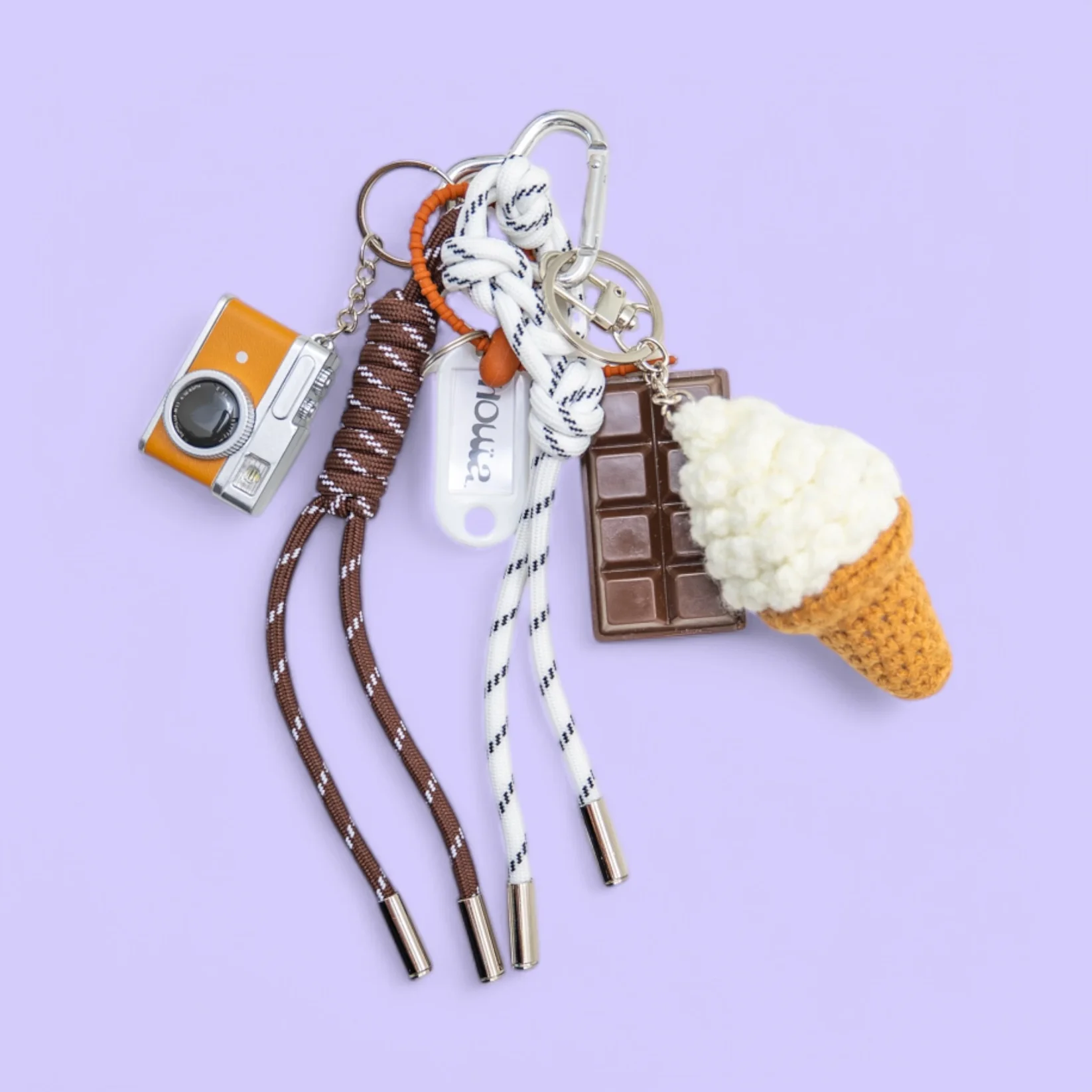Un bag charm irrésistible pour les amoureux de gourmandises ! Chocolat, glace crochetée et un appareil photo gadget avec un vrai flash pour capturer chaque moment sucré.
