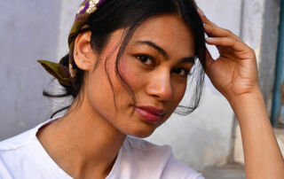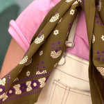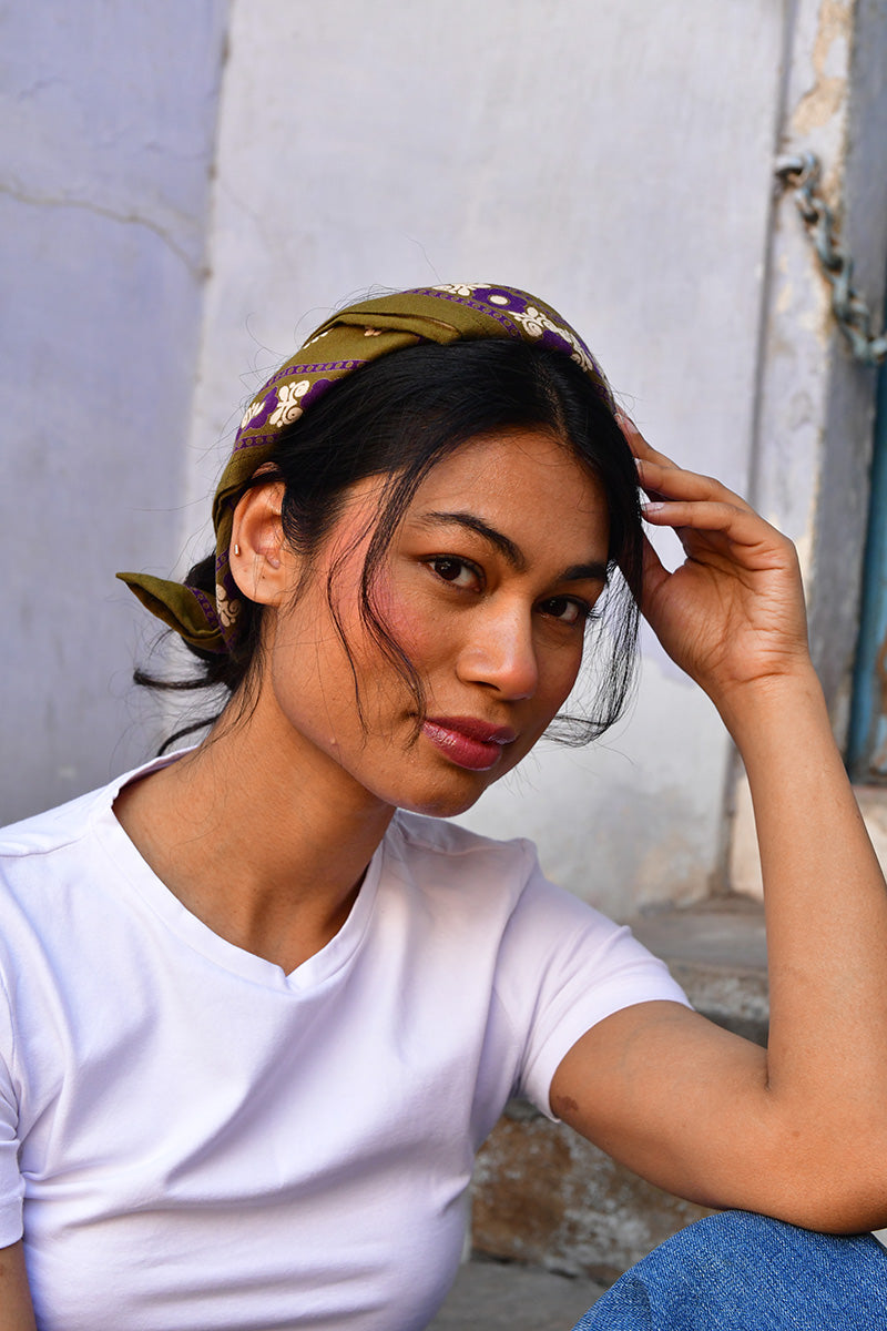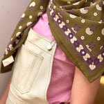 Des petites fleurs teintées d’écru et de violet sur un fond vert olive.