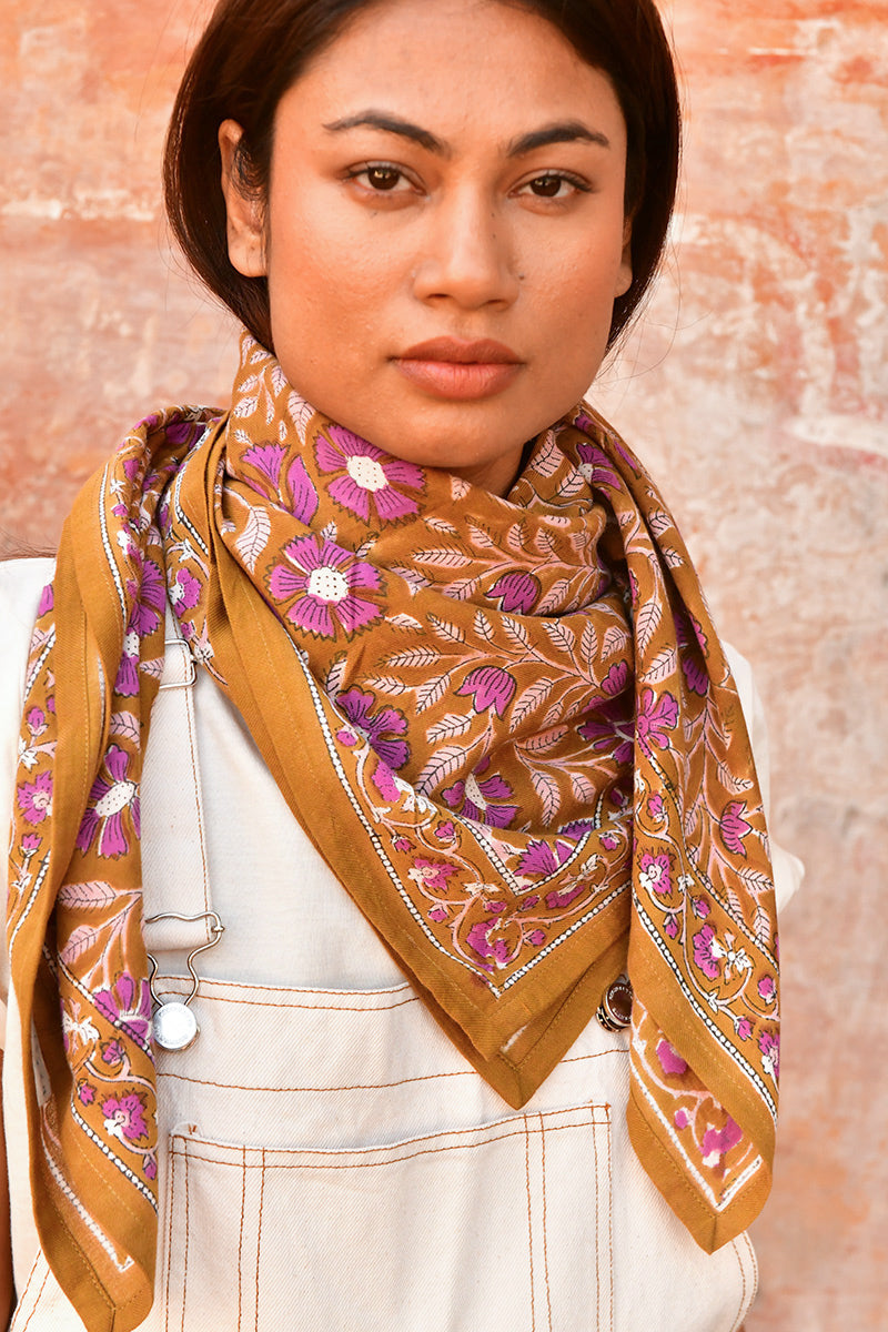 Des grandes fleurs violet prune, ses feuilles rosées et son fond caramel font du grand foulard N°115 Caramel un accessoire lumineux qui égayera toutes vos tenues. Un de nos préférés qui pourrait aussi vous séduire.