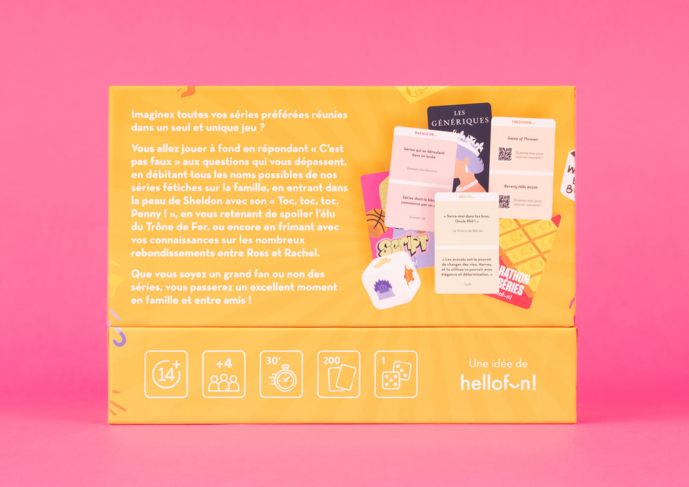 Imaginez toutes vos séries préférées réunies dans un seul et unique jeu ? Vous allez jouer à fond en répondant « c’est pas faux » aux questions qui vous dépassent, en débitant tous les noms possibles de nos séries fétiches sur la famille, en entrant dans la peau de Sheldon avec son « Toc, toc, toc, Penny ! », en vous tenant de spoiler l’élu du Trône de Fer, ou encore en frimant avec vos connaissances sur les nombreux rebondissements entre Ross et Rachel. Que vous soyez un grand fan ou non des séries, vous passerez un excellent moment en famille et entre amis !