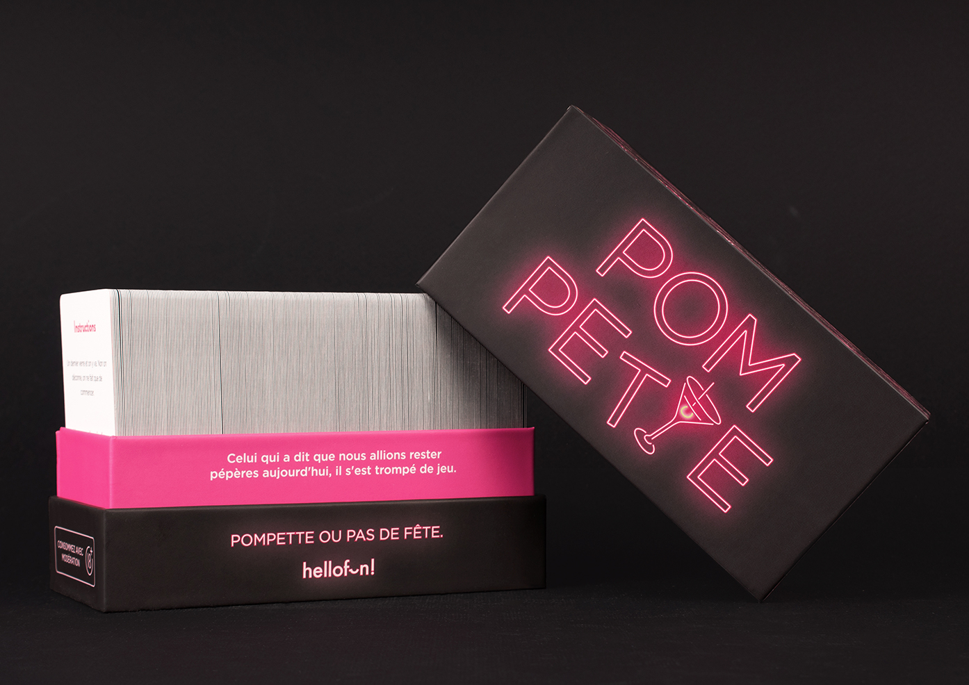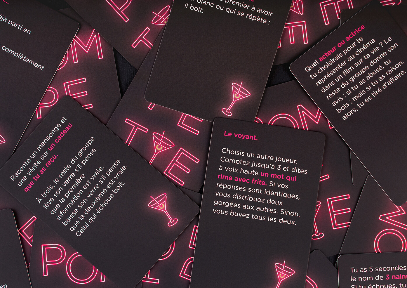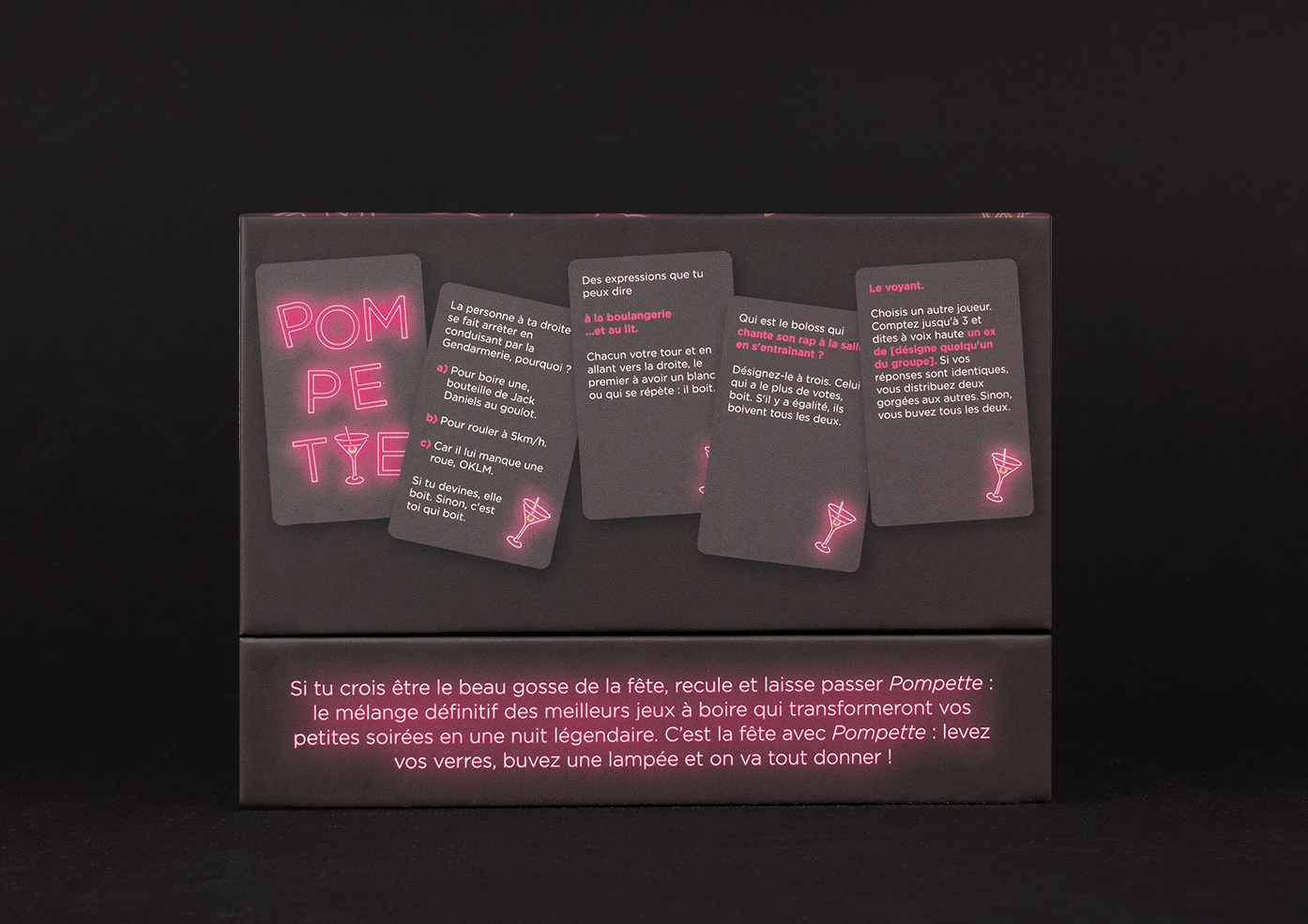 Si tu crois être le beau gosse de la fête, recule et laisse passer Pompette : le mélange définitif des meilleurs jeux à boire qui transformeront vos petites soirées en une nuit légendaire. C’est la fête avec Pompette : levez vos verres, buvez une lampée et on va tout donner !