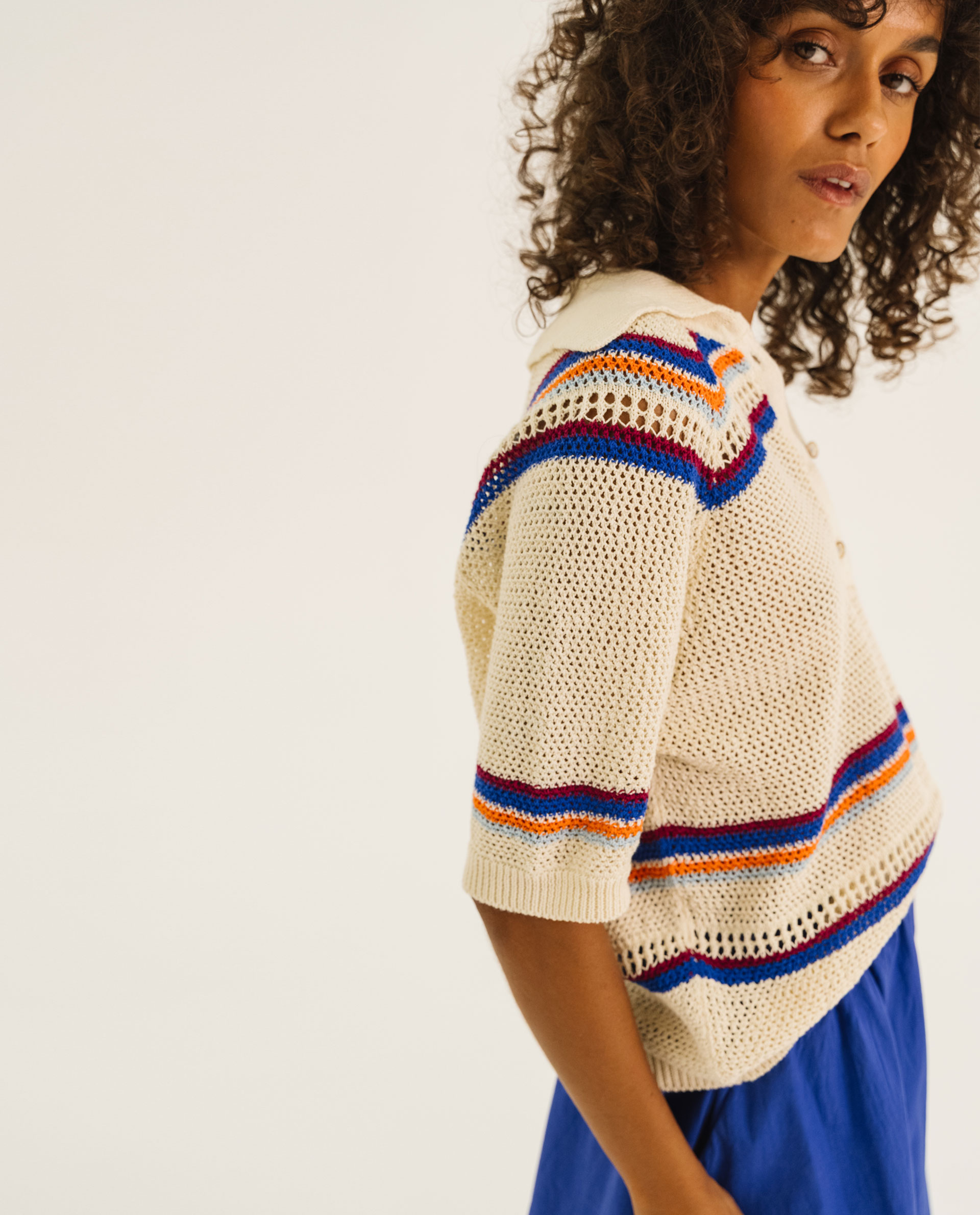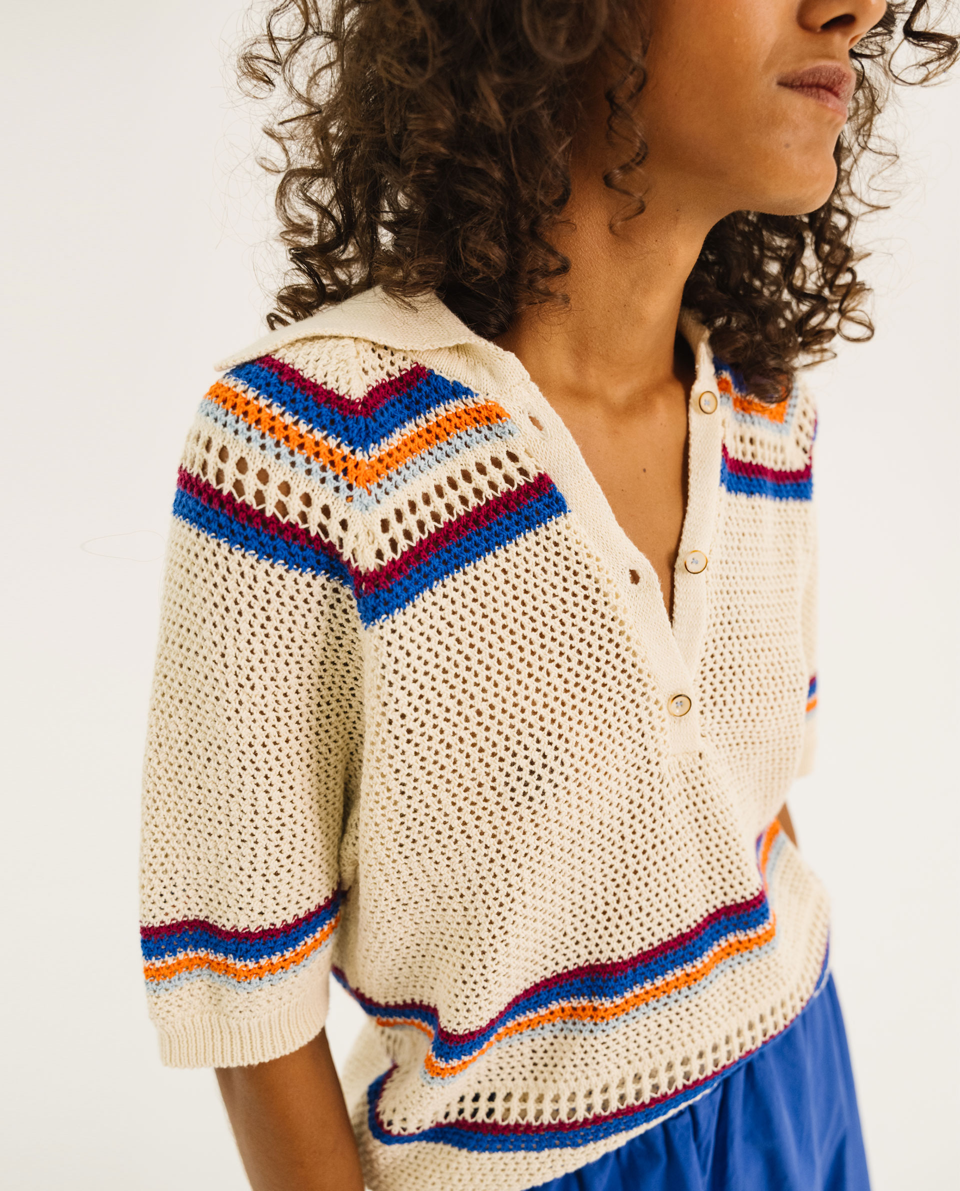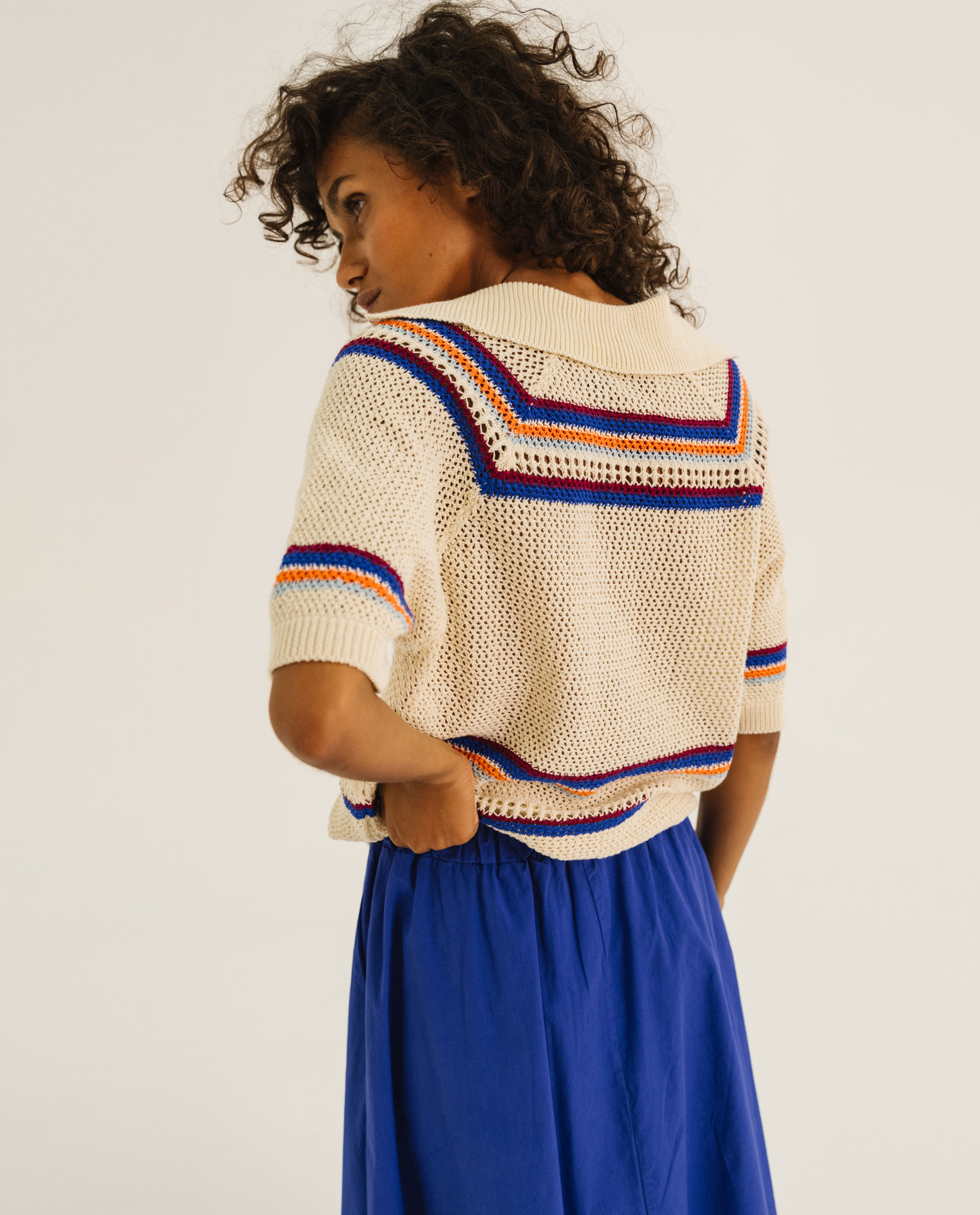 Polo en maille à l’esprit vintage. Tricoté dans un point crochet à rayures.