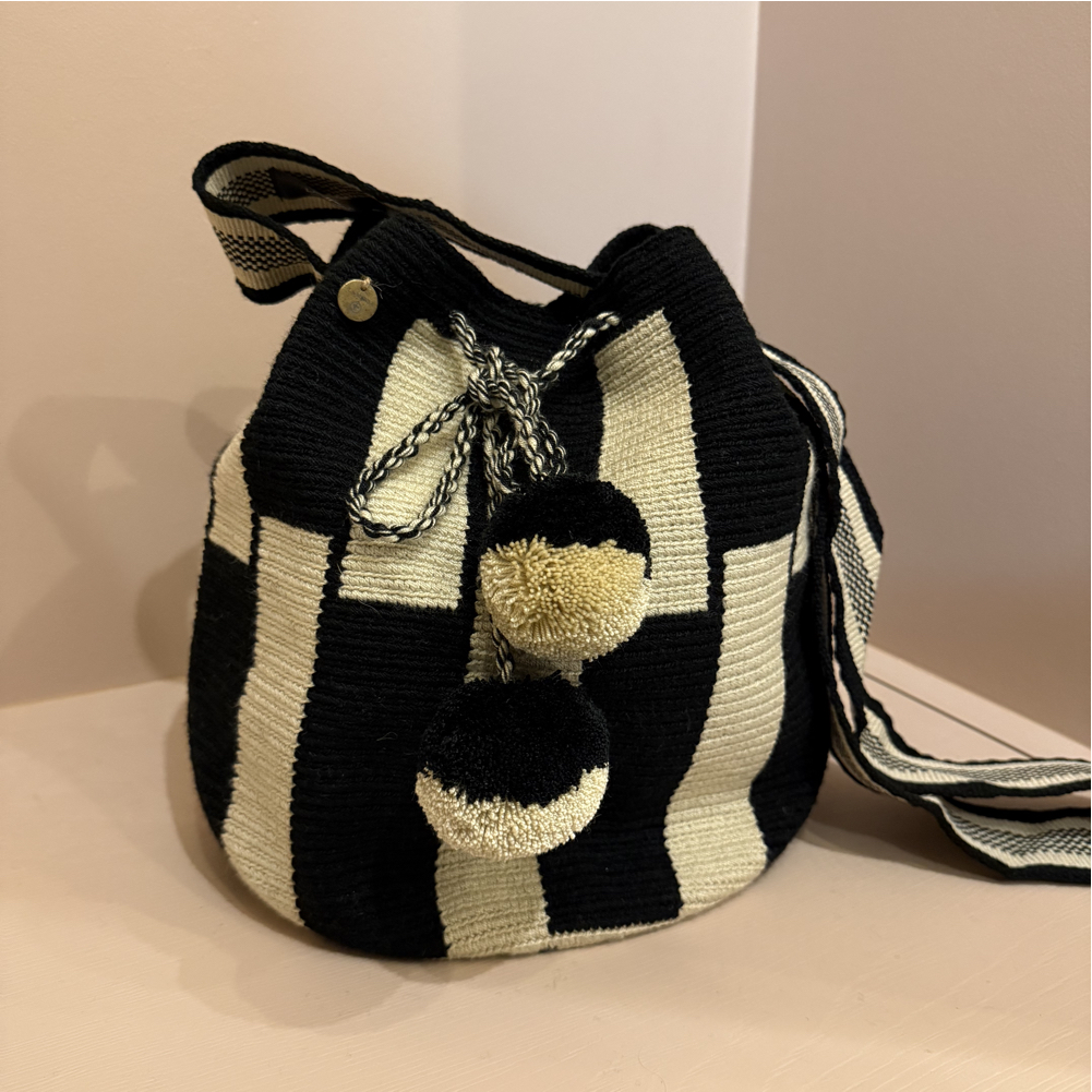 Sac seau avec deux cordons à pompons. Fabriqué à la main au crochet avec des points de surjet colorés.